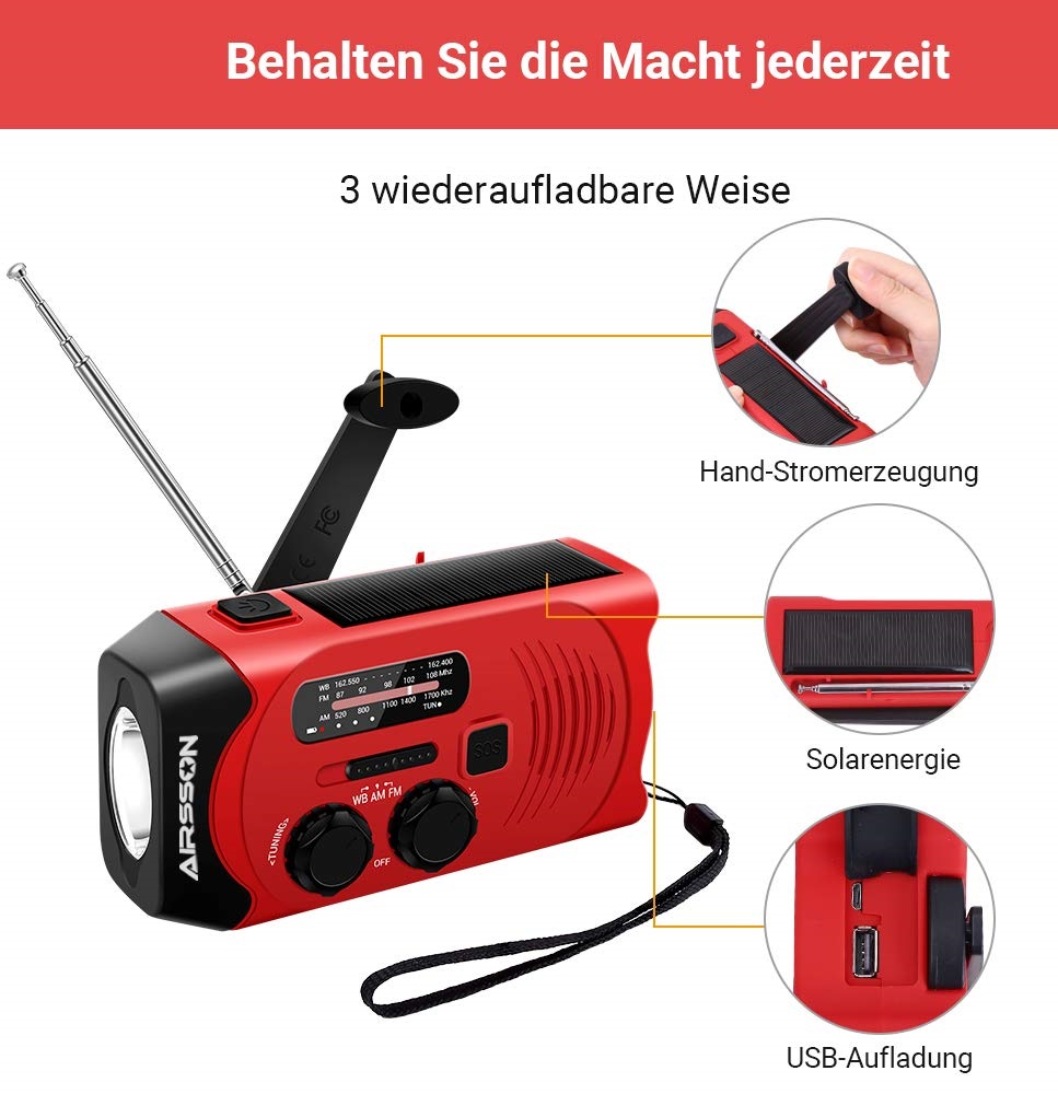 MEHR ALS NUR EIN RADIO:Solar Kurbel Radio mit AM/FM & NOAA Wetter Radio,LED Taschenlampe,2000mAh Power bank, Notfall SOS Alarm für Wandern,Camping,Ourdoor,Notfall. AM/FM & NOAA Wetter Radio und SOS Alarm: Bringen Sie sich auf dem neusten Stand von Wetter- und Gefahrenmeldungen in ihrer Umgebung und senden Sie Notfallsignale. 2000mAh POWER BANK:Versorgt in Notsituationen jedes mobile Gerät mit Notstrom. Funktioniert mit den meisten USB-Geräten. LED TASCHENLAMPE: Sorgt für helles Licht, um Sie aus der Dunkelheit fernzuhalten. IMMER AN DER MACHT:Das Radio verfügt über 3 wiederaufladbare Methoden:Solarbetrieben,Handkurbel angetrieben,und USB-Kabel betrieben.Viel Spaß jederzeit und überall.