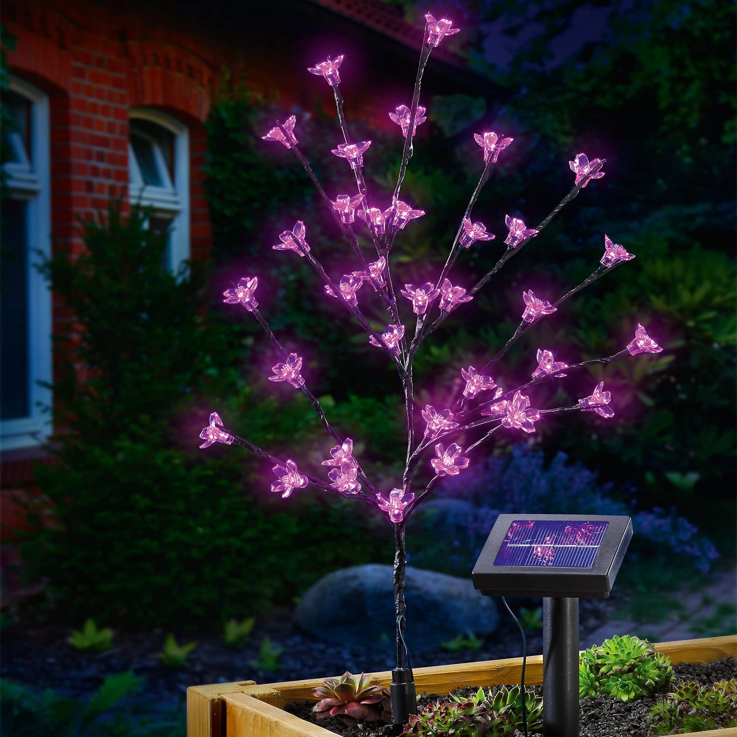 Produktbeschreibung esotec Solar LED Blütenstrauch Die Dekoidee für Haus, Garten und Balkon. Der Blütenstrauch kann nach eigener Fantasie gebogen werden. Über einen Erdspieß wird er dann einfach in den Boden oder Topf gesteckt. Die pinkfarbenen Blüten sind eine Besonderheit bei Tag und Nacht. Das Solarmodul kann über einen Erdspieß einfach in den Boden oder Topf gesteckt werden, das Anschlusskabel zum Strauch hat eine Länge von 2 m. Am Tag wird der Akku durch das Solarmodul geladen, bei Nacht schaltet sich die LED-Beleuchtung automatisch ein.