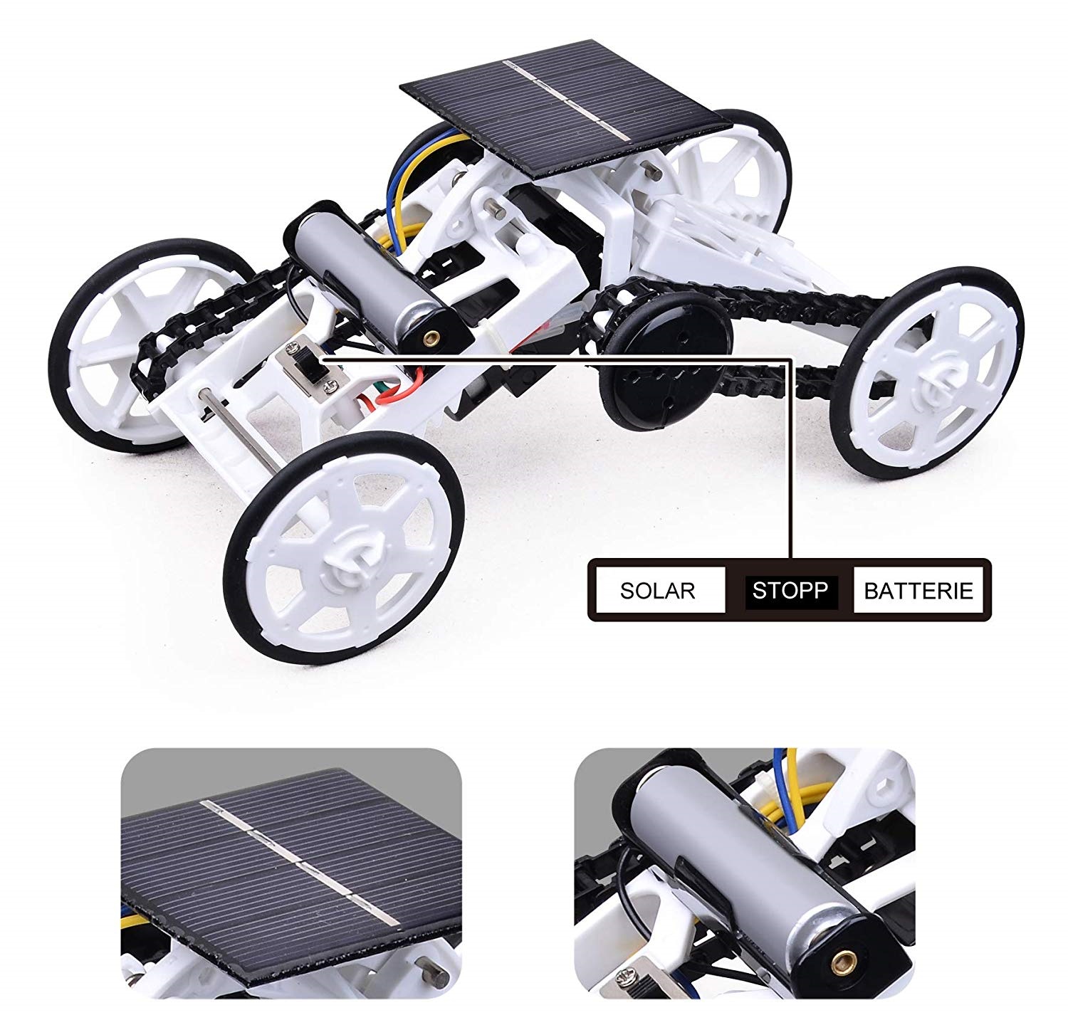 1. MINT(STEM)-Lernen: Mathematik, Informatik, Naturwissenschaft und Technik. Anstatt diese vier Lehrmethoden einzeln anzuwenden, ist es besser, sie zu kombinieren, um MINT im Leben zu verwenden. Lernen mit Spaß 2. Die Erfahrung bei der Montage von DIY-Bausteinen umfasst einfaches Einrasten, Anschrauben und Verkabeln, um die Montage abzuschließen. Es trainiert die Fähigkeit des Kindes, selbständig zu denken und Probleme selbst zu lösen 3. Das ist ein Modell mit Allradantrieb, das an verschiedenen Löchern montiert werden kann, um unterschiedliche Höhen zu erreichen, sodass das Auto Hindernisse mit einer Höhe von bis zu 50 mm mühelos überwinden kann 4. Es gibt zwei Modi: Einer muss von einer R6 / AA / UM3-Batterie gespeist werden, der andere von einem Solarpanel 5. Unter dem Impuls von Solar Energie, alternative Energie spielt eine entscheidende Rolle, es gibt keine bessere Zeit als jetzt zu lassen, beginnen die Kinder die grundlegenden Konzepte hinter der Kraftfahrzeugtechnik und die erneuerbaren Energien zu lernen. Glücklicherweise ist dieses Produkt wird mit Solarenergie betrieben, so dass keine Batterie erforderlich ist. Das Auto bewegt sich in direktem Sonnenlicht, so dass die Kinder zu schaffen und ihre unendliche Phantasie verwenden