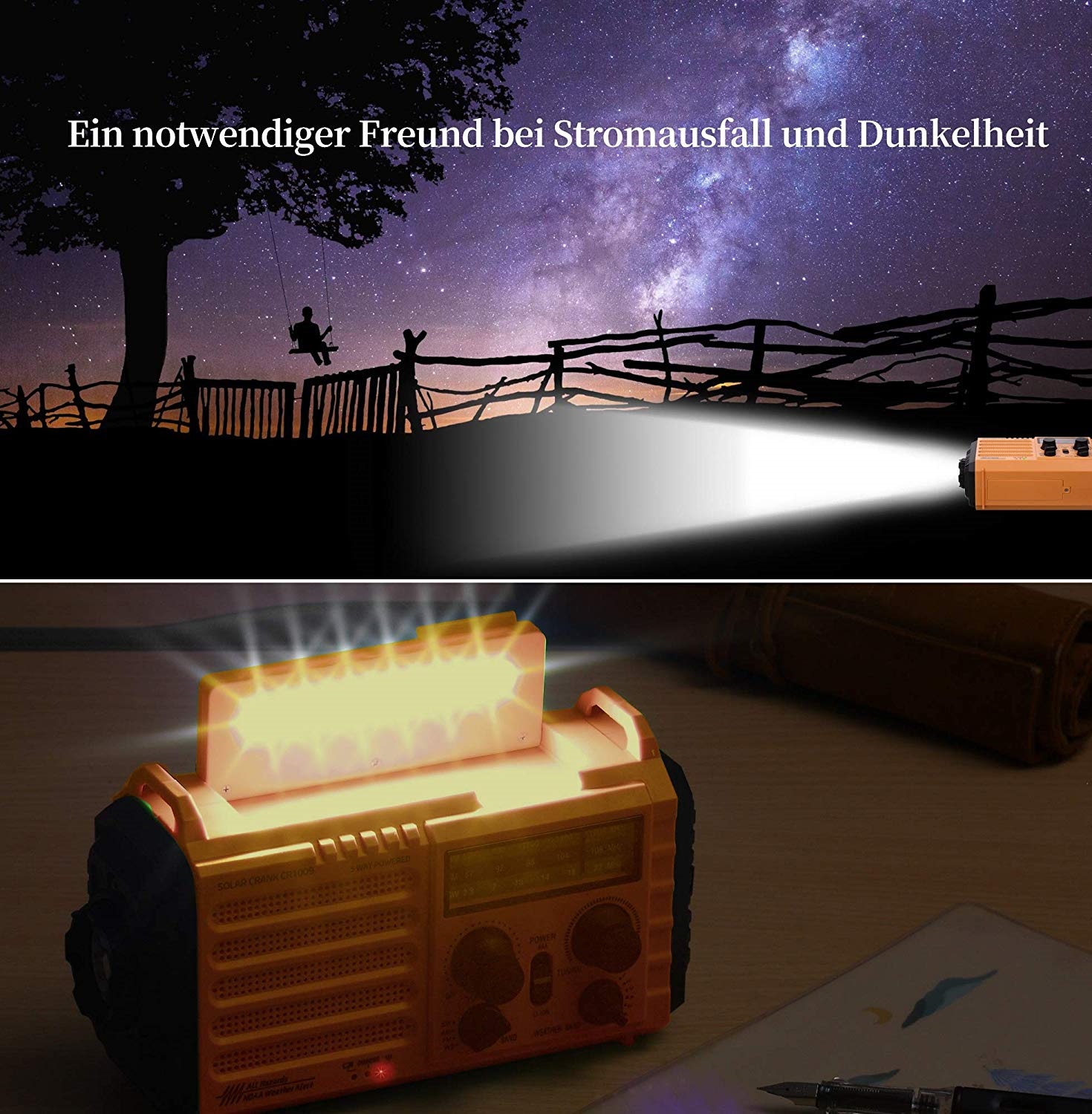 Unser Notfallwetterfunkgerät bietet Ihnen 2 Lichtquellen: eine 5-W-starke und helle Taschenlampe und eine 6-LED-Leselampe. Die Taschenlampe ist hell genug, um sich im Dunkeln zurechtzufinden. Leselampe ist ideal zum Lesen, Spielen, Abendessen wegen seiner weiten Sicht. Lautes SOS-Alarm- und USB-Telefon-Ladegerät für den Notfall